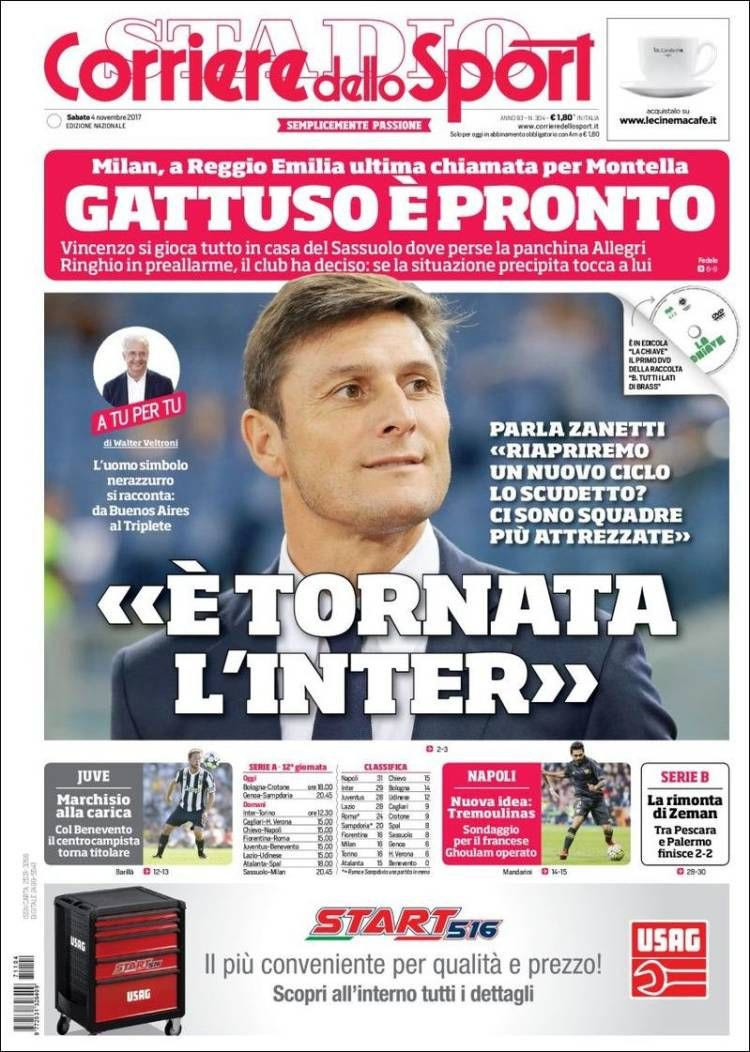 Στο ίδιο μήκος κύματος και η “Corriere dello Sport” που αναφέρει στο πρωτοσέλιδό της: “Η τελευταία ευκαιρία του Μοντέλα στην Ρέτζιο Αιμίλια, ο Γκατούζο είναι έτοιμος. Ο Βιτσέντσο τα παίζει όλα για όλα στο σπίτι της Σασουόλο, εκεί που έχασε τη θέση του ο Αλέγκρι. Ο Ρίνγκιο είναι στο θάλαμο αναμονής, ο σύλλογος έχει αποφασίσει να στηριχτεί πάνω του αν χρειαστεί”.