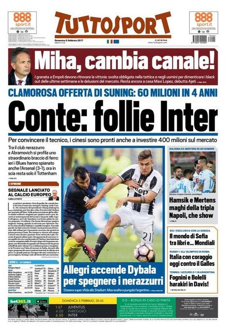 Υπάρχει όμως και… συνέχεια αφού σύμφωνα με το εν λόγω μέσο, οι διοικούντες των “νερατζούρι” θα δώσουν μπάτζετ 400.000.000 ευρώ στην επόμενη μεταγραφική περίοδο για να διαχειριστεί ο Κόντε ενώ θα του υποσχεθούν πως αν συμφωνήσει θα του “κλείσουν” τρεις ποδοσφαιριστές: τον Μάρκο Βεράτι από την Παρί Σεν Ζερμέν, τον Φεντερίκο Μπερναρντέσκι από την Φιορεντίνα και τον Κώστα Μανωλά από την Ρόμα για τον οποίο έχει εκφράσει ενδιαφέρον τώρα που είναι στον πάγκο της Τσέλσι.