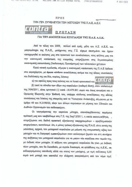 Συγκεκριμένη πρόταση για τη διάσωση και εξυγίαση της ΠΑΕ ΑΕΚ, κατέθεσαν οι μικρομέτοχοι. Βασικός πυρήνας της πρότασης είναι η αυξομείωση του μετοχικού κεφαλαίου και η έκδοση νέων μετοχών με τιμή εκδόσεως 0,33 ευρώ η καθεμία.