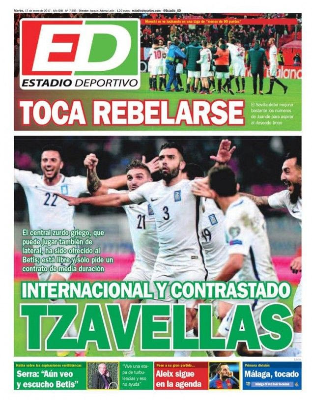 Και η συγκεκριμένη είδηση δεν περνάει στα… ψιλά, καθώς αποτελεί μέχρι και πρωτοσέλιδα (!) στην αθλητική εφημερίδα “Estadio Deportivo” που κυκλοφορεί στην Ανδαλουσία. Μάλιστα γράφουν οι Ισπανοί “Διεθνής και ελεύθερος Τζαβέλλας: Ο Έλληνας αριστερός αμυντικός μπορεί να παίξει επίσης στα άκρα, έχει προταθεί στην Μπέτις, είναι ελεύθερος και το μόνο που ζητάει είναι συμβόλαιο μικρής διάρκειας”.