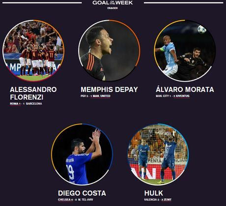 Τα υποψήφια είναι: α) Αλεσάντρο Φλορέντσι (Ρόμα-Μπαρτσελόνα), β) Μέμφις Ντεπάι (Αιντχόβεν-Μάντσεστερ Γιουνάιτεντ), γ) Αλβάρο Μοράτα (Μάντσεστερ Σίτι-Γιουβέντους), δ) Ντιέγκο Κόστα (Τσέλσι-Μακάμπι Τελ Αβίβ) και ε) Χουλκ (Βαλένθια-Ζενίτ).