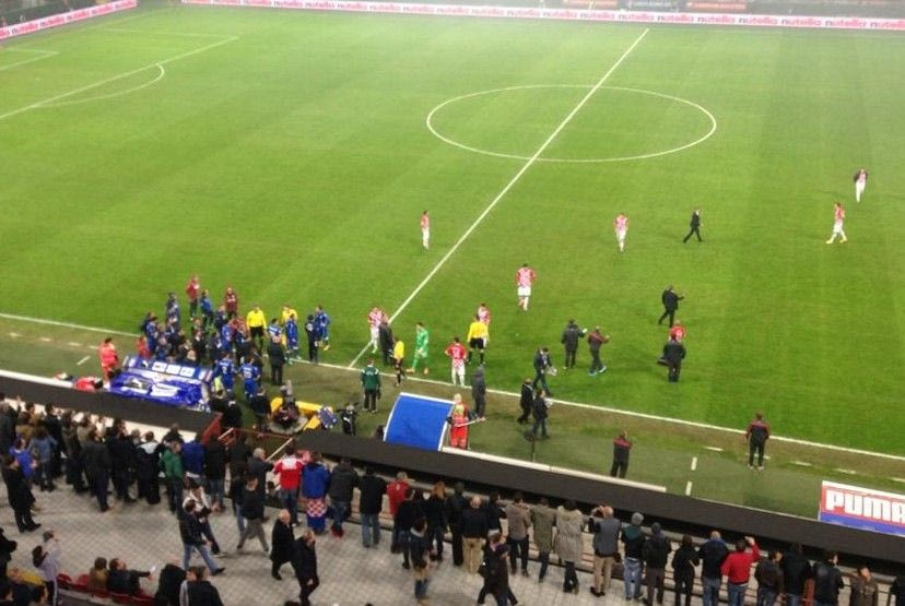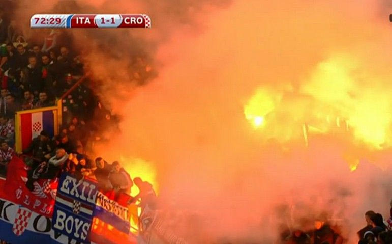 Χωρίς να υπάρχει κάποιος προφανής λόγος, οι Κροάτες πέταξαν δεκάδες καπνογόνα στον αγωνιστικό χώρο του "Σαν Σίρο", με συνέπεια να διακοπεί στο 73ο λεπτό η αναμέτρηση με την Ιταλία.