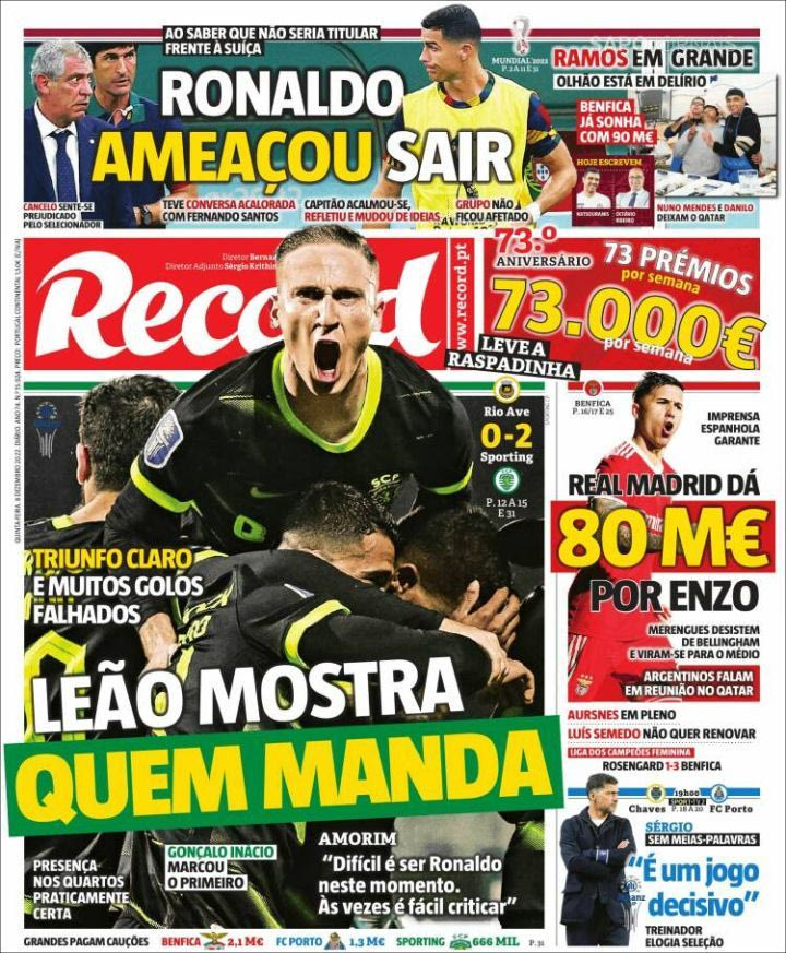 Φοβερά πράγματα υποστηρίζει πρωτοσέλιδα η RECORD καθώς γράφει ότι ο Ρονάλντο απείλησε τον Σάντος πως θα φύγει.