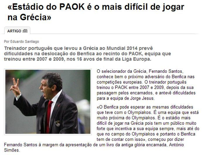 Ο Φερνάντο Σάντος μιλώντας σε Μέσο της πατρίδας του, αναφέρθηκε στις επικείμενες αναμετρήσεις του ΠΑΟΚ με την Μπενφίκα, χαρακτηρίζοντας την Τούμπα ως δυσκολότερη έδρα από το "Γ. Καραϊσκάκης".