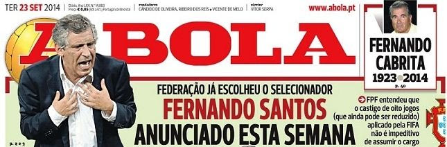 Δημοσιεύματα από την Πορτογαλία αναφέρουν ότι ο Φερνάντο Σάντος είναι προ των πυλών της ανάληψης της τεχνικής ηγεσίας του αντιπροσωπευτικού συγκροτήματος της χώρας του. "Μέσα στην εβδομάδα οι ανακοινώσεις" υποστηρίζει η "A Bola".