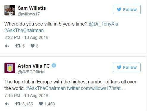 Ο Τόνι Ξία, πρόεδρος της Άστον Βίλα πιστεύει πως “σε πέντε χρόνια οι χωριάτες θα είναι ο κορυφαίος σύλλογος στην Ευρώπη με τον μεγαλύτερο αριθμό φιλάθλων στον κόσμο”.