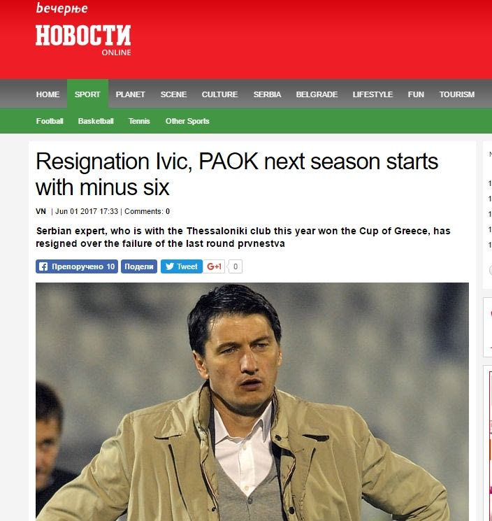 Σύμφωνα με σερβικό δημοσίευμα ο Βλάνταν Ίβιτς υπέβαλε την παραίτησή του μετά την αποτυχία του ΠΑΟΚ να τερματίσει στην πρώτη θέση των πλέι οφ, με τον Μιρτσέα Λουτσέσκου να αποτελεί τον εκλεκτό για την αντικατάστασή του στον "ασπρόμαυρο" πάγκο.