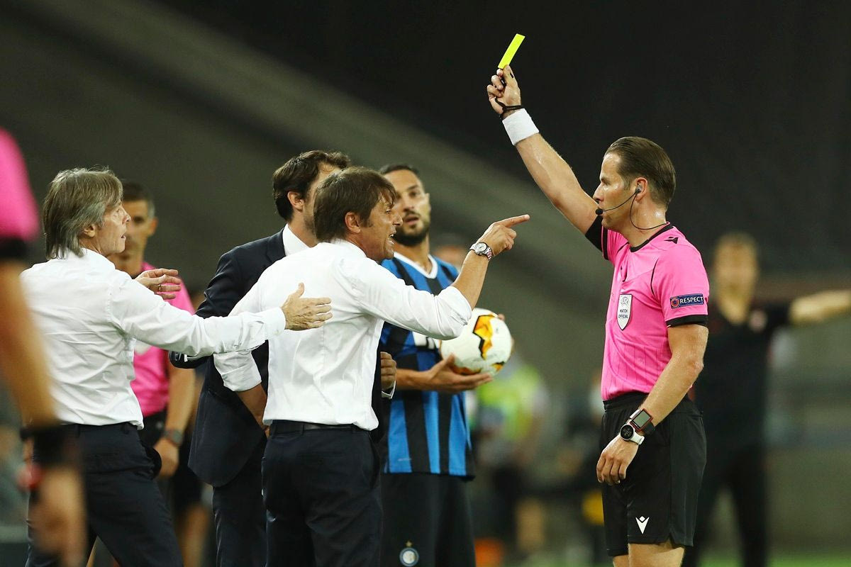 Ο προπονητής της Ίντερ, Αντόνιο Κόντε, δέχεται κίτρινη κάρτα από τον διαιτητή Ντάνι Μακέλιε κόντρα στη Σεβίλλη για τον τελικό του Europa League 2019-2020 στο 'Ράιν Ένεργκι Στάντιον' της Κολονίας | Παρασκευή 21 Αυγούστου 2020 AP Photo/Lars Baron