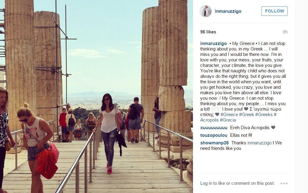 “Δεν μπορώ να σταματήσω να σε σκέφτομαι, Ελλάδα μου. Μου λείπεις και θα ήθελα να βρίσκομαι εκεί τώρα. Είμαι ερωτευμένη μαζί σου, με το χάος σου, τα φρούτα σου, το χαρακτήρα σου, το κλίμα σου, την αγάπη που δίνεις. Μοιάζεις με άτακτο παιδί που δεν κάνει πάντα το σωστό, αλλά σου δίνει όλη την αγάπη του κόσμου μέχρι να τρελαθείς και να τo αγαπήσεις περισσότερο από κάθε άλλο. Σ’ αγαπώ τώρα”.