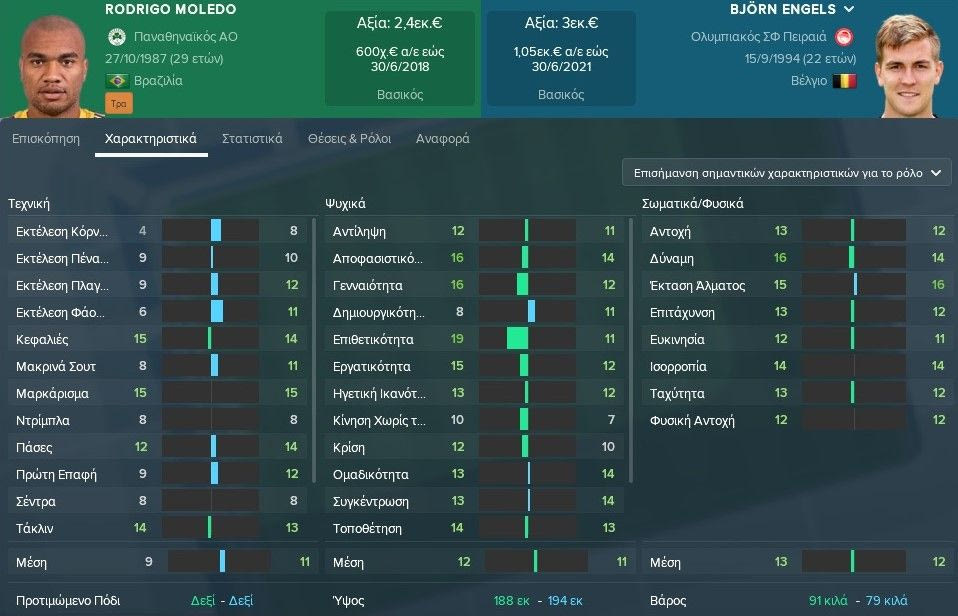 Πιο τεχνίτης ο Ένχελς, πιο δυνατός ο Μολέδο και μικρό προβάδισμα στο κομμάτι των ψυχικών χαρακτηριστικών, εκεί που το 19 σε επιθετικότητα του Μολέδο… βγάζει μάτι.