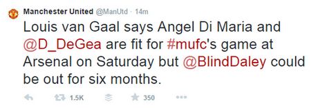 Το αρχικό tweet ανέφερε: “Ο Λουίς φαν Χάαλ λέει ότι οι Ντι Μαρία και Ντε Χέα είναι έτοιμοι για το ματς της Γιουνάιτεντ με την Άρσεναλ, αλλά ο Μπλιντ μπορεί να μείνει εκτός μέχρι και έξι μήνες”.