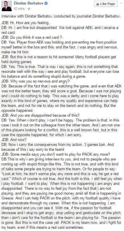 Μέσω μια απίστευτης ανάρτησής του στο facebook, o επιθετικός του ΠΑΟΚ, Ντίμιταρ Μπερμπάτοφ παραχώρησε συνέντευξη στον εαυτό του (!) και σχολίασε την αποβολή του στο ντέρμπι με την ΑΕΚ, αλλά και το πως αισθάνεται στον δικέφαλο του Βορρά.