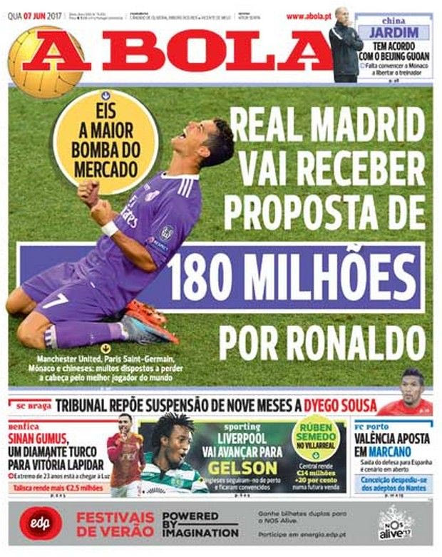 “Η Ρεάλ θα δεχτεί πρόταση 180 εκατομμυρίων ευρώ για τον Ρονάλντο”, είναι ο τίτλος στο σημερινό πρωτοσέλιδο της πορτογαλικής εφημερίδας, η οποία συμπληρώνει πως οι πιο ισχυρές υποψήφιες για να καταθέσουν αυτή την πρόταση είναι οι Μάντσεστερ Γιουνάιτεντ, Παρί Σεν Ζερμέν και Μονακό, ενώ υπάρχει πάντως και η… Κίνα, με σύλλογο από την ασιατικη χώρα να έχει τη δυνατότητα για τέτοια πρόταση μαμούθ!