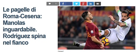“Διάβαζε καθυστερημένα τις φάσεις και ερχόταν δεύτερος σε ταχύτητα σε προσωπικές μονομαχίες. Ο άλλος Κώστας παραμομορφώθηκε από τον 25χρονο φορ της Τσεζένα, Αλεχάντρο Ροντρίγκες, που φιλοδοξεί να γίνει ο νέος Οσβάλντο. Ο Μανωλάς τους κέρδισε όλους όσον αφορά στην κούρσα για τον χειρότερο του γηπέδου”, αναφέρει η ιστοσελίδα “Laroma24.it” που τον βαθμολογεί με 4.
