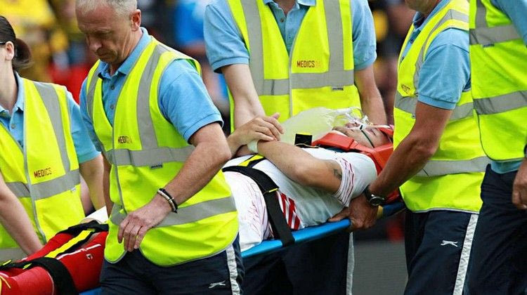 Η διακομιδή του Ιταλού επιθετικού εκτός αγωνιστικού χώρου έγινε με φορείο, κολάρο και μάσκα οξυγόνου.
