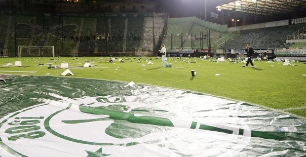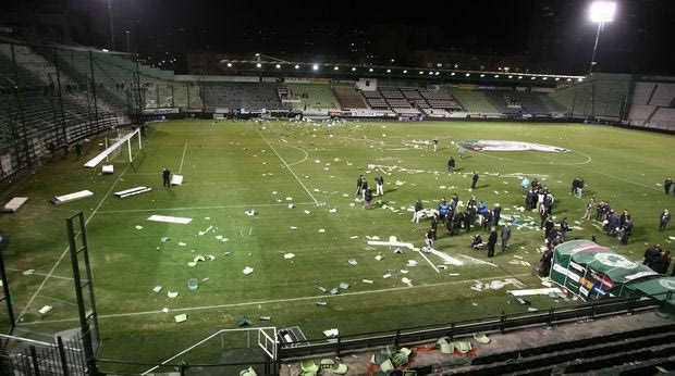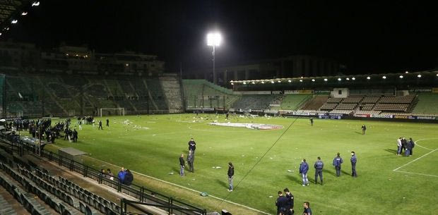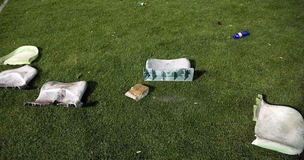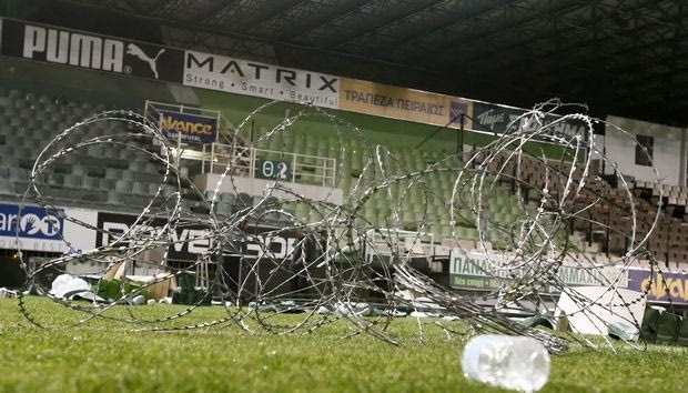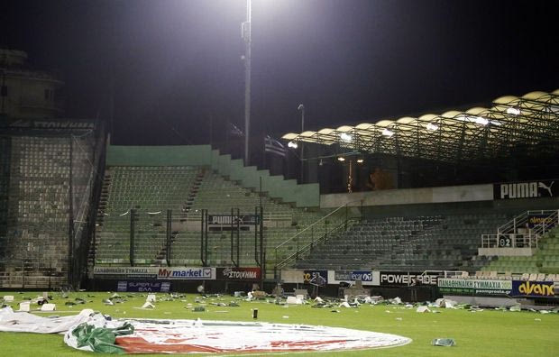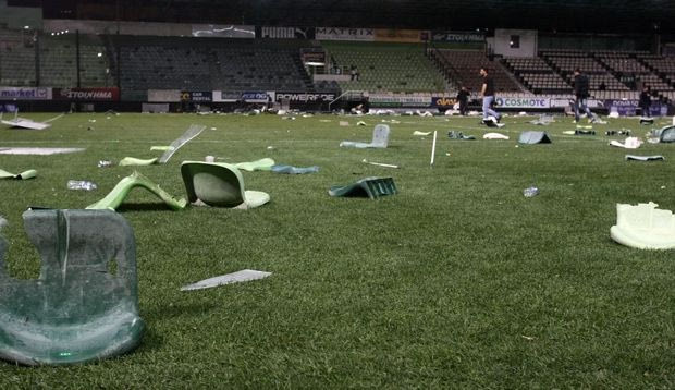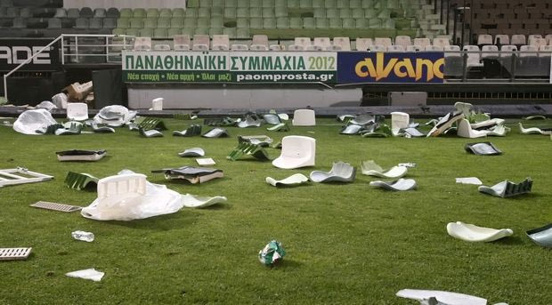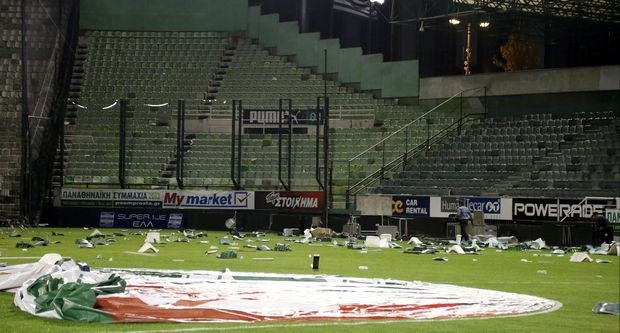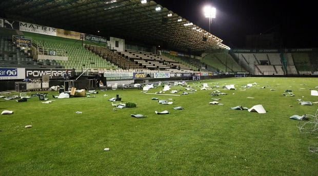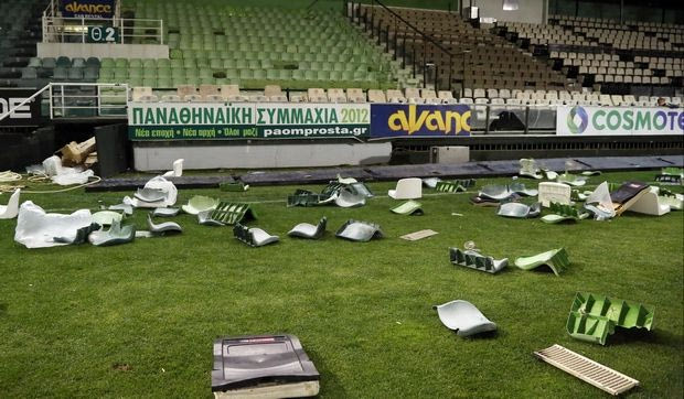 Δείτε την εικόνα του γηπέδου του Παναθηναϊκού λίγη ώρα μετά την εισβολή των οπαδών των γηπεδούχων, η οποία θυμίζει πεδίο μάχης.