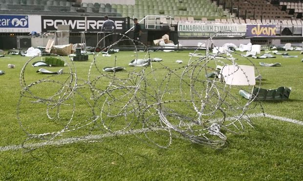 Πέτρες, καθίσματα, φωτοβολίδες, συρματοπλέγματα! Αυτά συναντά κανείς αν κάνει μια βόλτα στον αγωνιστικό χώρο του “Απόστολος Νικολαΐδης” λίγο μετά το ντου των οπαδών του Παναθηναϊκού.