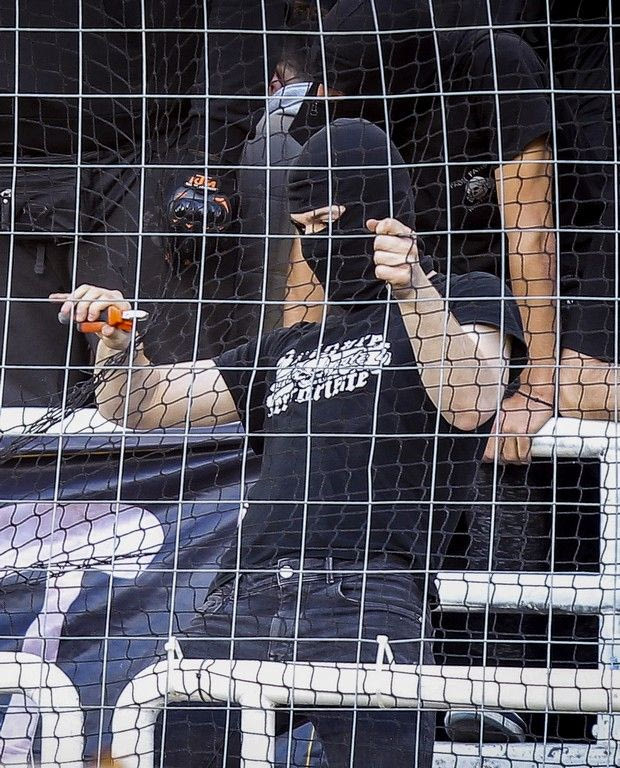 Οι φωτοβολίδες έφευγαν βροχή, τα καπνογόνα δημιούργησαν εκρηκτική ατμόσφαιρα, ενώ οπαδοί είχαν μαζί τους μέχρι και κοπίδια για να κάνουν επαγγελματική δουλειά και να κόβουν τα συρματοπλέγματα που είχαν τοποθετηθεί για να τους αποτρέψουν να πλησιάσουν τους “αντιπάλους”.