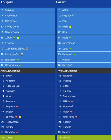 Ο “Ίμπρα”, πέραν του (ομολογουμένως καταπληκτικού) τέρματος και 2-3 καλών μεταβιβάσεων, δεν είχε να επιδείξει τίποτα. Ο Βίλχελμσον έπαιξε μόνο για ένα ημίχρονο, οπότε ο κλήρος πέφτει στον Όλοφ Μέλμπεργκ, ο οποίος είχε σπουδαία παρουσία τόσο ανασταλτικά (και δη στο 2ο μέρος, όταν με τάκλιν της τελευταίας στιγμής κόντραρε πολλά σουτ των Γάλλων με καλές προϋποθέσεις), όσο κι επιθετικά, αφού σε κάθε στημένη φάση προκαλούσε “πονοκεφάλους” στη Γαλλία.