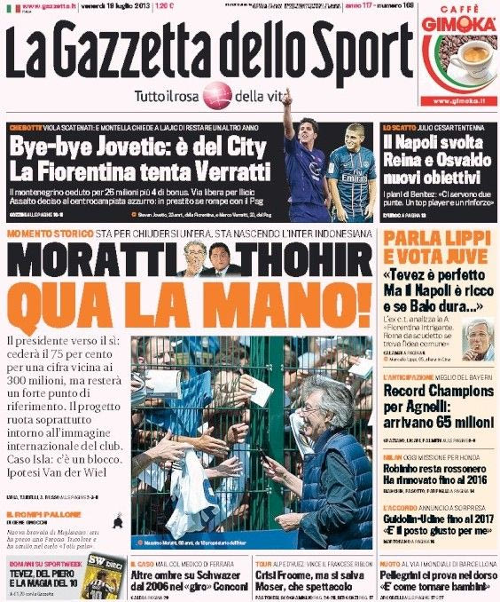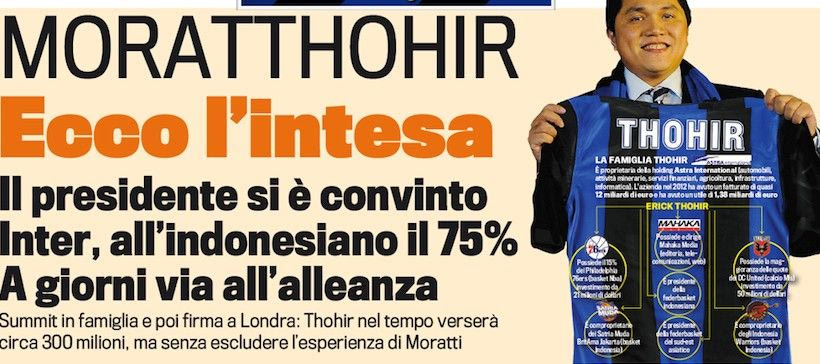 Ο Μάσιμο Μοράτι υπέκυψε στο ασφυκτικό πρέσινγκ του Έρικ Τοχίρ και αποφάσισε να παραχωρήσει το 75% των μετοχών της Ίντερ έναντι του ποσού των 300.000.000 ευρώ, σύμφωνα με το δημοσίευμα της "Gazzetta dello Sport".