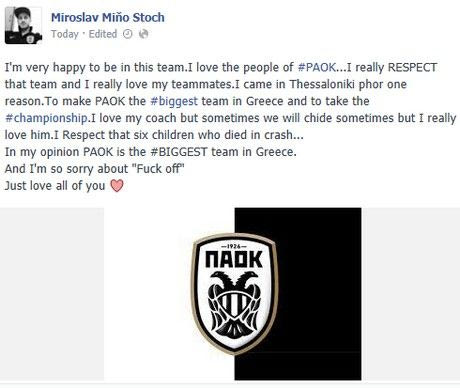 Λίγες μέρες μετά το... f@ck off που εκστόμισε στα Χανιά και την τιμωρία του από την ομάδα του ΠΑΟΚ, ο Μίροσλαβ Στοχ, έκανε δήλωση μεταμέλειας μέσα από σελίδα του σε μέσο κοινωνικής δικτύωσης.
