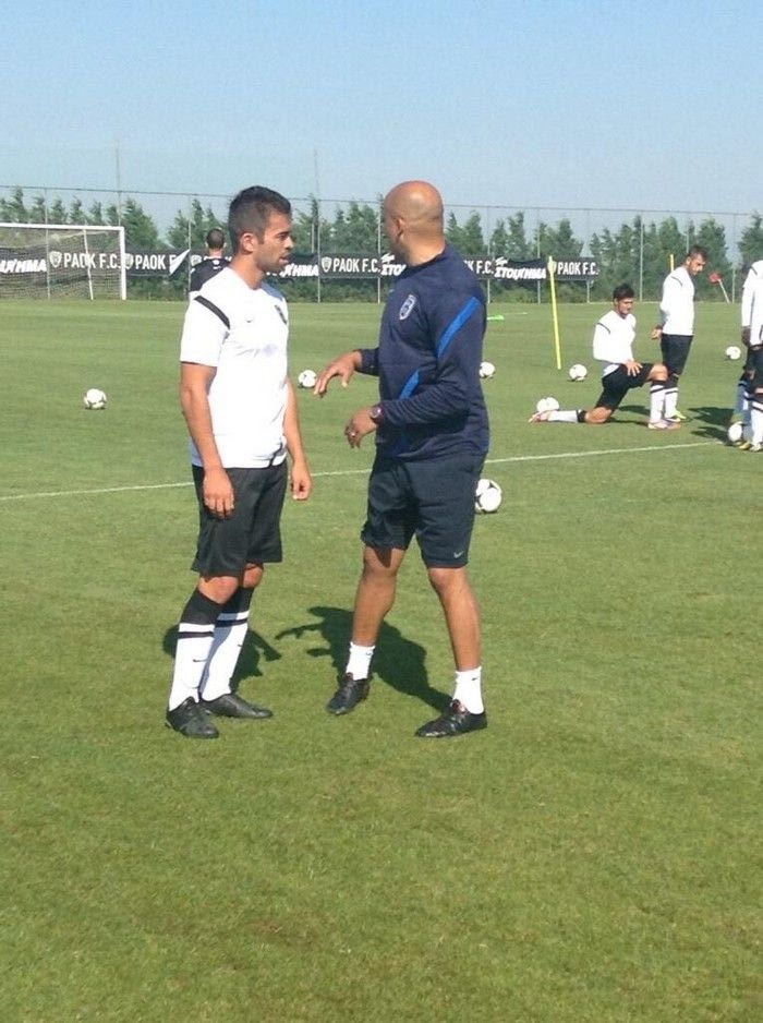 Ο νεοαποκτηθείς ποδοσφαιριστής του ΠΑΟΚ μαζί με το γυμναστή της ομάδας στην πρωινή προπόνηση της Δευτέρας (1/7).