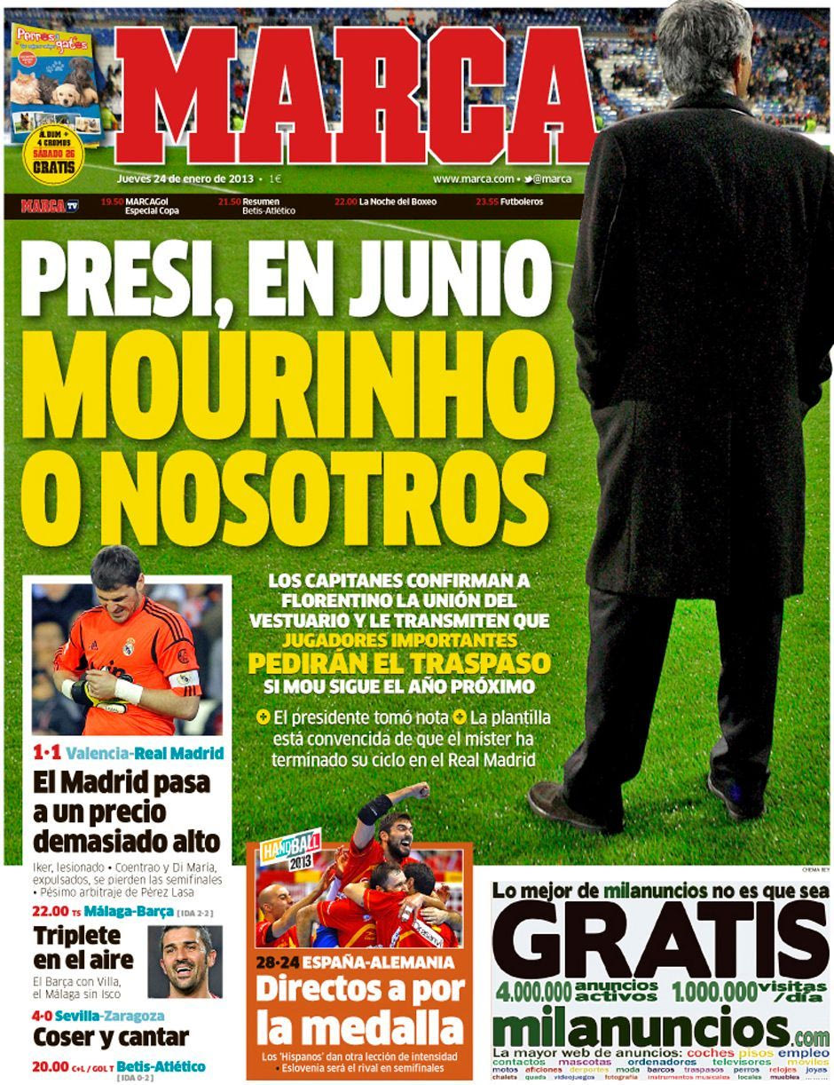 Αξίζει να σημειωθεί, πάντως, πως μετά τις φετινές αποτυχίες, η “Marca” έχει εναντιωθεί αρκετές φορές στον Πορτογάλο τεχνικό. Μετά από ορισμένες αμφιλεγόμενες δηλώσεις του, μάλιστα, του έχει ασκήσει δριμεία κριτική, με συνέπεια να τοποθετηθεί γρήγορα απέναντί του, κάτι που έχει αντιληφθεί κι ο ίδιος ο Μουρίνιο. Εξάλλου, σύσσωμος ο ισπανικός Τύπος θεωρεί ότι οποιαδήποτε κι αν είναι η κατάληξη της σεζόν για τη φετινή σεζόν, ο 49χρονος προπονητής θα αποτελέσει παρελθόν στο τέλος της σεζόν, παρότι ανανέωσε το συμβόλαιό του για 4 χρόνια το Μάιο του 2012, με πιθανότερο προορισμό την Αγγλία.