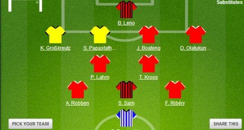 Οι Τζερόμ Μπόατενγκ και Ντάβιντ Αλάμπα συμπληρώνουν την τετράδα της άμυνας, οι Φίλιπ Λαμ, Τόνι Κρόος, Άριεν Ρόμπεν και Φρανκ Ριμπερί βρίσκονται πιο μπροστά, ενώ τη… διαφορά κάνουν ο Μπερντ Λένο στο τέρμα και ο Σίντνεϊ Σαμ (αμφότεροι της Λεβερκούζεν) πίσω από Άντριαν Ράμος (Χέρτα).