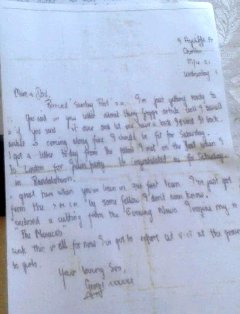 Οταν ο Μπεστ έφυγε για το Μάντσεστερ έτσι ώστε να ενταχθεί στις ακαδημίες της Γιουνάιτεντ βρισκόταν στην πρώιμη εφηβική ηλικία. Οι δικοί του άνθρωποι, και κυρίως οι γονείς του, του έλειπαν. Τους έγραφε, όχι όμως πολύ συχνά όπως και ο ίδιος παραδέχεται σ’ ένα από τα γράμματά του που φυλάσσονται μέχρι και σήμερα στο σπίτι της οδού Burren. “Μαμά, μπαμπά, συγγνώμη που δεν σας έχω γράψει” ξεκινά το πόνημα του Μπεστ ο οποίος στη συνέχεια βέβαια θα απογαλακτιστεί πλήρως για να γίνει, σταρ, ίνδαλμα, το απόλυτο ποδοσφαιρικό φαινόμενο της δεκαετίας του 60 στη Μεγάλη Βρετανία και όχι μόνο. Στο ίδιο εκείνο γράμμα, ως παιδί που λαχταρά να αφηγηθεί στιγμές από το νέο του κόσμο, εξιστορεί σκηνές από ένα παιχνίδι που παρακολούθησε μεταξύ της Αγγλίας και της Βραζιλίας.