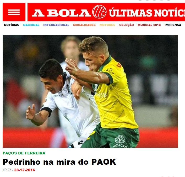 Σύμφωνα με τα πορτογαλικά ρεπορτάζ ο ΠΑΟΚ εξετάζει σοβαρά το ενδεχόμενο απόκτησης του 24χρονου μεσοεπιθετικού της Πάσος Φερέιρα, Πεδρίνιο.