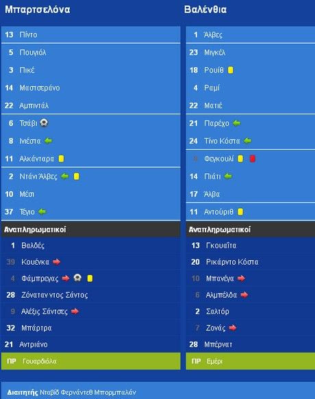 Τελικά έφτασαν στο δεύτερο τέρμα, που ήταν και το τελικό αποτέλεσμα, με τον Τσάβι στο 81ο λεπτό κόντρα σε μία Βαλένθια που αγωνιζόταν με παίκτη λιγότερο μετά από αποβολή του Φεγκουλί στο 76ο λεπτό.