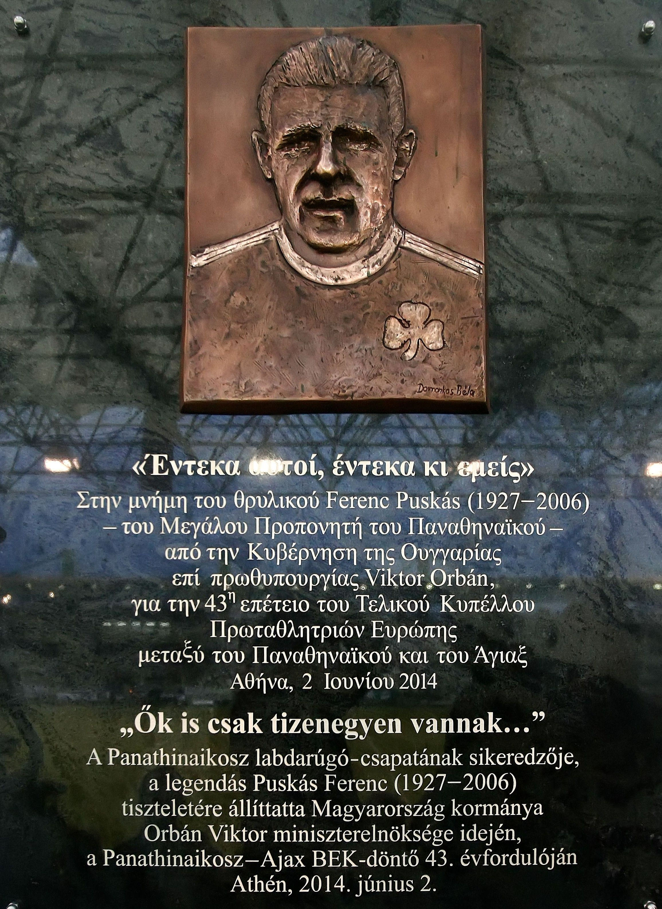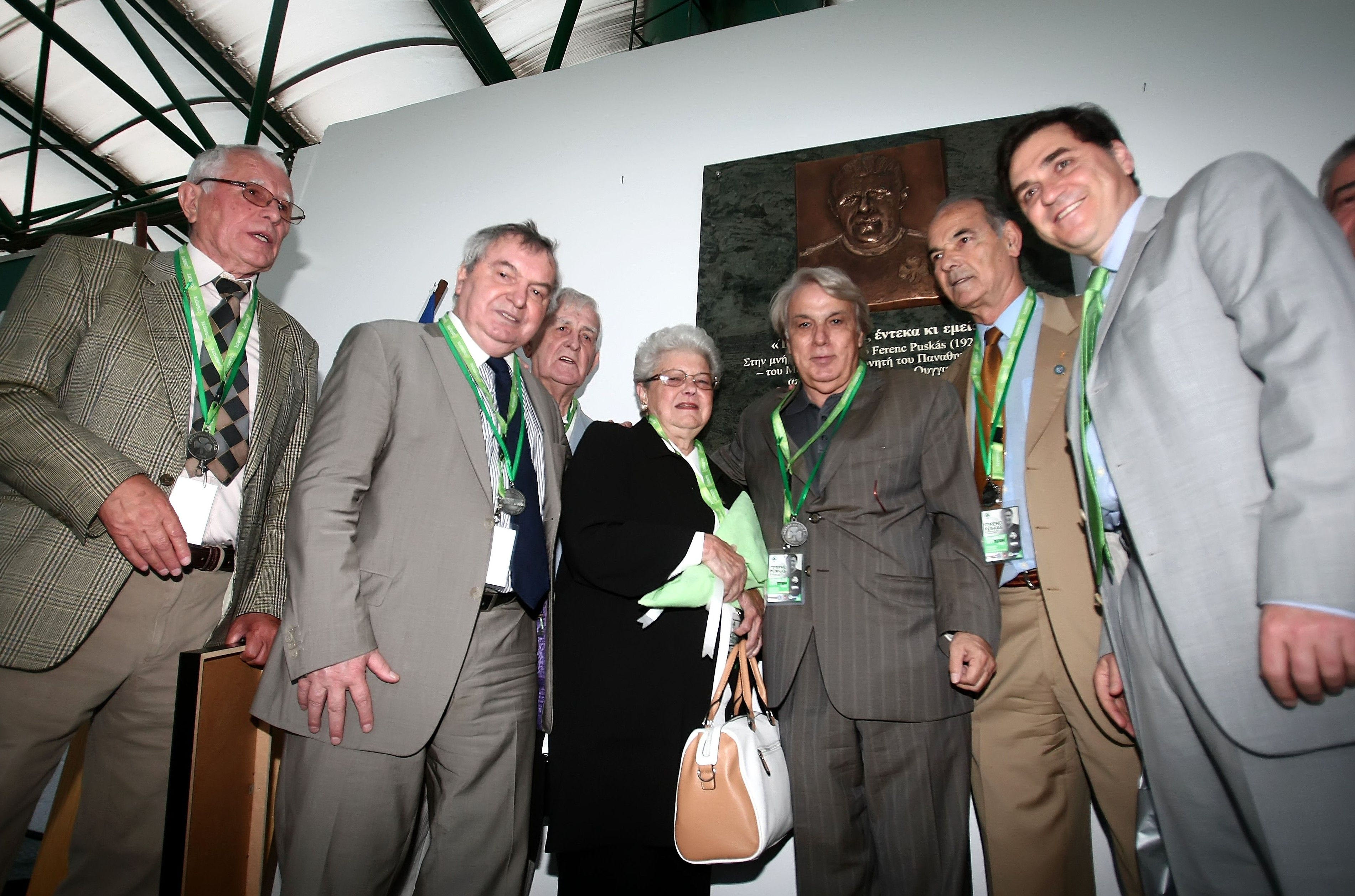 Λίγη ώρα πριν από το φιλικό του Παναθηναϊκού Κ17 με την ακαδημία Πούσκας και 43 χρόνια μετά το έπος του “Γουέμπλεϊ”, αποκαλύφθηκε στη Θύρα 3 μία μαρμάρινη στήλη με την προσωπογραφία του κορυφαίου Ούγγρου ποδοσφαιριστή και με χαραγμένη τη γνωστή του φράση “έντεκα αυτοί, έντεκα κι εμείς”.