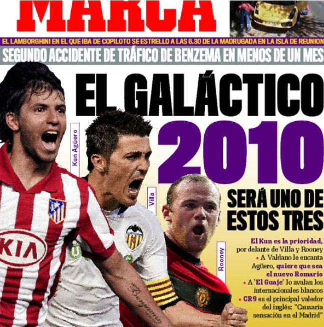 Εκεί που έσπασαν όλα τα κοντέρ, όμως, ήταν στην αναζήτηση επιθετικού για το 2010. Ο Πέρεθ εγγυήθηκε ότι ένας εκ των Σέρχιο Αγκουέρο, Βίγια και Γουέιν Ρούνεϊ θα κατέληγε στο “Σαντιάγο Μπερναμπέου” και η “Marca” δεν δίστασε να τους βάλει και τους 3 μαζί στο ίδιο πρωτοσέλιδο. Η ιστορία έγραψε ότι και για τη φετινή Μπενφίκα του Ζορζέ Ζεζούς: 0/3.