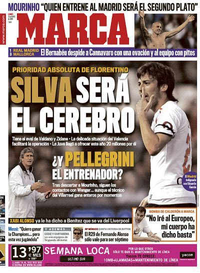 Ομοίως, ο Ντάβιντ Σίλβα δεν έγινε ποτέ ο “εγκέφαλος” της Ρεάλ, παρότι ήταν “απόλυτη προτεραιότητα του Φλορεντίνο Πέρεθ”. Κλου: το καπέλο της εφημερίδας, όπου ο Ζοζέ Μουρίνιο δήλωνε ότι ο “όποιος προπονήσει τη Ρεάλ Μαδρίτης θα είναι από το κυρίως μενού”. Τελικά την ανέλαβε ο Μανουέλ Πελεγκρίνι (η απάντηση δόθηκε στη “Marca” λίγο αργότερα), ένας προπονητής που στοχοποιήθηκε από τον Πορτογάλο ως ανεπαρκής.