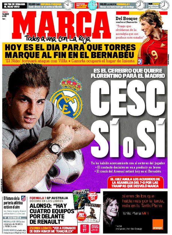 Λίγο καιρό αργότερα, ο Φλορεντίνο Πέρεθ αναθεώρησε σχετικά με τον “εγκέφαλο που ζητάει για τη Ρεάλ Μαδρίτης”, οπότε αναθεώρησε και η “Marca”. Το δίλημμα για τον Τσεσκ Φάμπρεγας ήταν ένα: “Ναί ή ναι”. Όχι…