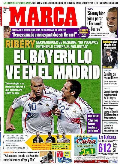 Τον Φεβρουάριο του ίδιου έτους και με το παιχνίδι της φάσης των 16 του Champions League με τη Λίβερπουλ να πλησιάζει, η “Marca” επέμεινε μεταγραφικά. Κι έστελνε τον Φρανκ Ριμπερί στη Ρεάλ. Συγκεκριμένα, τον έστελνε η Μπάγερν Μονάχου, αφού ούτε ο Φραντς Μπενεκνμπάουερ μπορούσε να πάει “κόντρα στην επιθυμία του”.