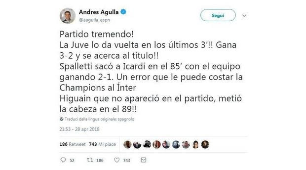 Βγήκε αυτός και η Γιούβε σημείωσε δύο γκολ σε δύο λεπτά”, σχολίασε διαδικτυακά ο Αργεντινός δημοσιογράφος, Μάρκο Τινέγι, με την σύντροφο του Ικάρντι να κάνει retweet το σχόλιο αυτό θέλοντας να αυξήσει την πίεση της αμφισβήτησης προς το πρόσωπο του προπονητή.