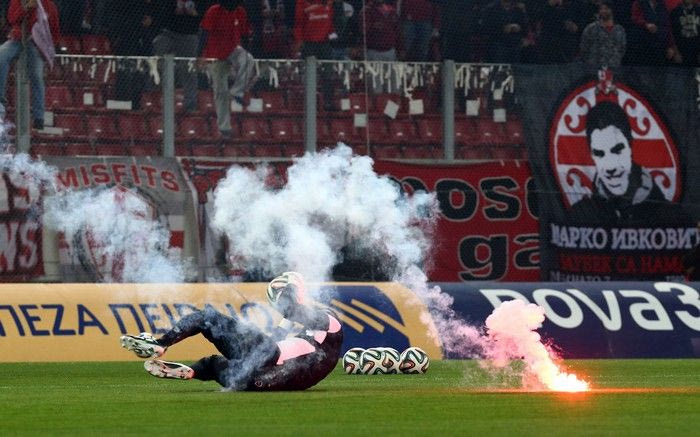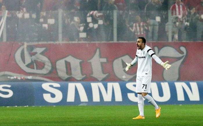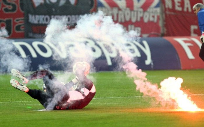 Ο τερματοφύλακας του ΠΑΟΚ, Παναγιώτης Γλύκος, χτυπήθηκε από ένα καπνογόνο που έριξαν οι οπαδοί του Ολυμπιακού στον αγωνιστικό χώρο λίγο πριν την έναρξη του ντέρμπι.