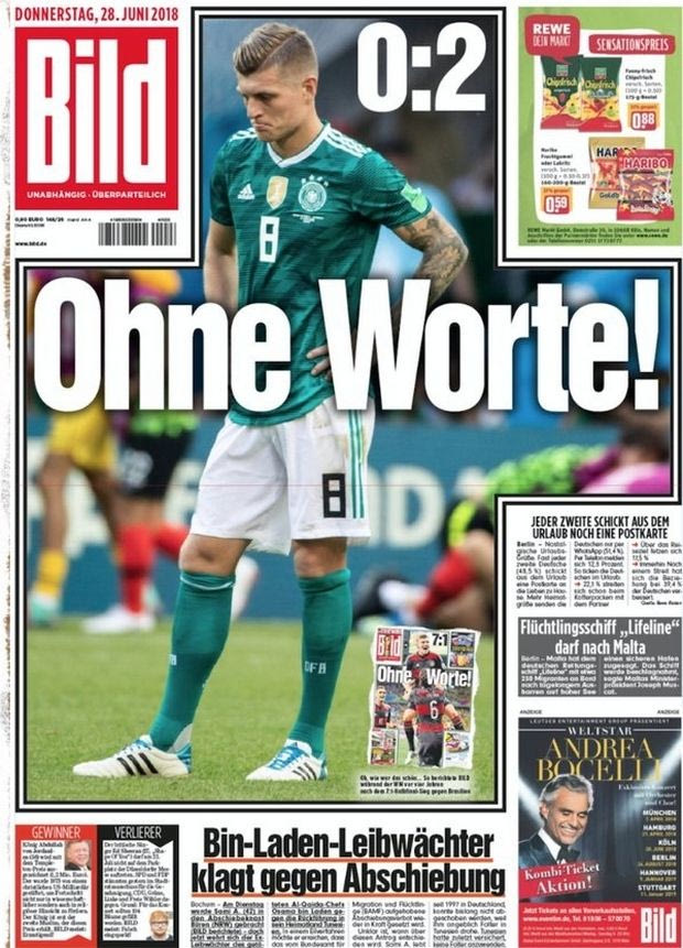 “Χωρίς Λόγια” . Με αυτόν τον τίτλο κυκλοφόρησε η “Bild”, η οποία έχει φόντο τον Τόνι Κρόος με θλιμμένο ύφος και σκυμμένο το κεφάλι, μην μπορώντας να πιστέψει τι έχει συμβεί. Kάτω δεξιά υπάρχει το πρωτοσέλιδο που είχε βγει μετά τον αλησμόνητο θρίαμβο με 7-1 επί της Βραζιλίας. Αν προσέξετε καλά θα παρατηρήσετε ότι έχουν τον ίδιο τίτλο: “Ohne Worte” .