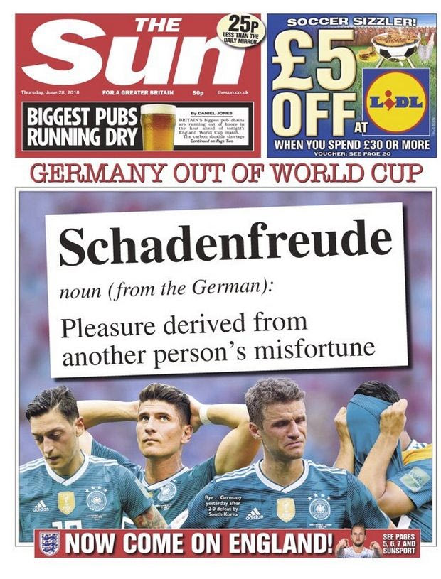 Σας έχουμε bonus το πρωτοσέλιδο της “Sun”. Οι Βρετανοί επιστράτευσαν το… ξεχωριστό τους χιούμορ και πίκαραν την ομάδα του Λεβ με την γερμανική λέξη “Schadenfreude” , εξηγώντας τι σημαίνει: “Ουσιαστικό: Ικανοποίηση που έρχεται απ’ την κακοτυχία κάποιου άλλου”.