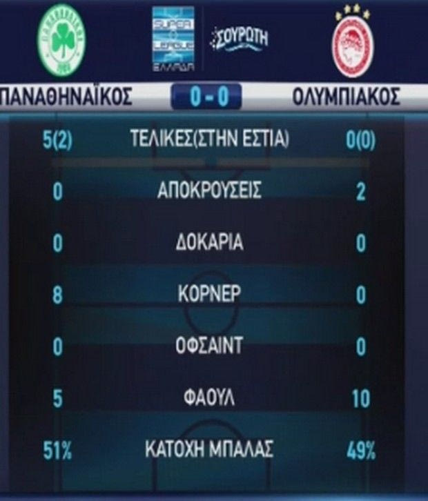 Χωρίς γκολ το πρώτο ημίχρονο στο ντέρμπι της Λεωφόρου μεταξύ Παναθηναϊκού και Ολυμπιακού. Αρνητικό πρόσημο στους "ερυθρόλευκους" οι τελικές και τα κόρνερ.