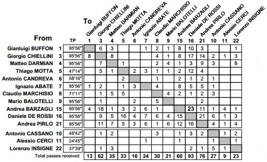Αυτήν τη φορά δεν υπήρχε Αγγλία να μην μαρκάρει, υπήρχε Κόστα Ρίκα με αλληλοκαλύψεις και επίθεση στον αντίπαλο που είχε την κατοχή. Το passing game της Ιταλίας θύμισε το ανούσιο ισπανικό τίκι τάκα των τελευταίων ετών, όπως μαρτυρούν και οι αριθμοί. Ο πιο δημοφιλής συνδυασμός στον αγώνα ήταν η πάσα του Αντρέα Μπαρτζάλι στον Ντανιέλε ντε Ρόσι (23), ενώ πήρε και 17 πάσες από τον Τζιόρτζιο Κιελίνι. Η πιο δημοφιλής πάσα του μέσου της Ρόμα ήταν στον Αντρέα Πίρλο, ενώ έδωσε 16 φορές την μπάλα στον Τιάγκο Μότα και 15 την επέστρεψε στον Μπαρτζάλι. Η πιο δημοφιλής πάσα του Πίρλο ήταν ο Ντε Ρόσι (12) και ο Κιελίνι (11), ήτοι γύριζε την μπάλα πίσω.