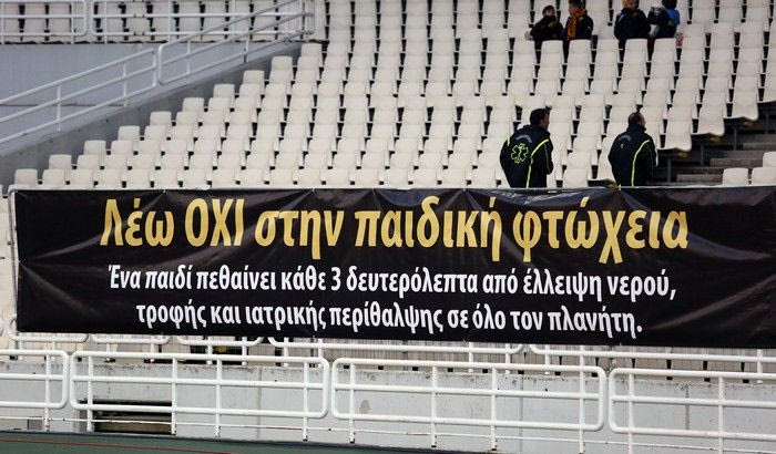 Επιπλέον, οι φίλοι της ΑΕΚ ανάρτησαν ένα μαύρο πανό κατά της παιδικής φτώχειας.