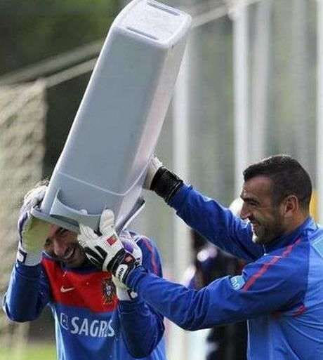 Δείτε χαρακτηριστικές φωτογραφίες από το πολύ καλό κλίμα που επικρατεί μεταξύ των ποδοσφαιριστών στην εθνική Πορτογαλίας. Τα πειράγματα του άσου της Μάντσεστερ Γιουνάιτεντ και τον υπολοίπων στον “νέο” Βιεϊρίνια, έναν παίκτη να μένει με το εσώρουχο και άλλον να δέχεται ένα κάδο με σκουπίδια στο κεφάλι.