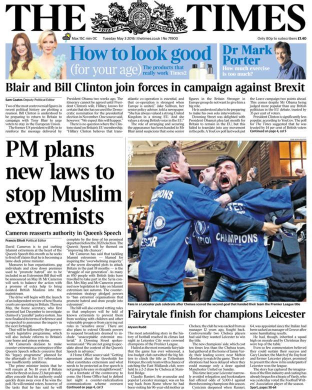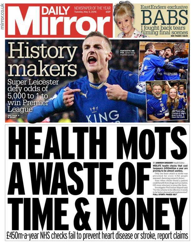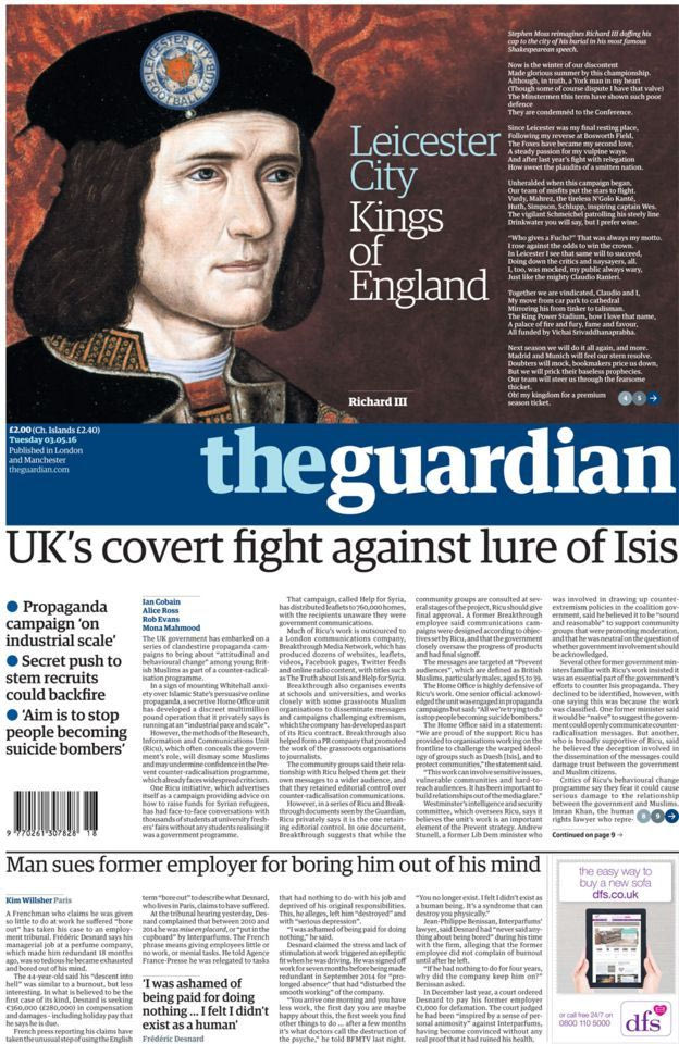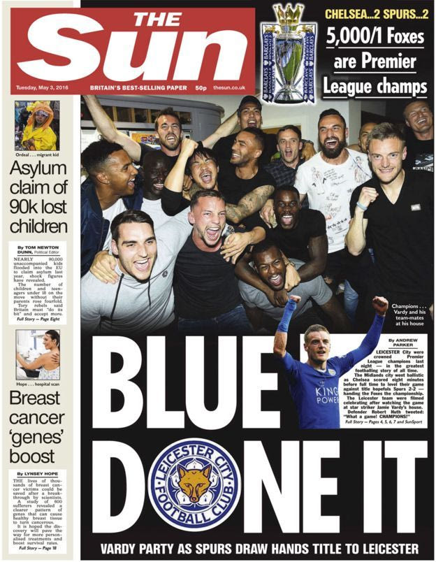 Πολλές αναφορές γίνονται στο μέγεθος της έκπληξης που μαρτυρά η απόδοση 5000/1 στα στοιχήματα πριν από την έναρξη της σεζόν. Ξεχωριστό και το πρωτοσέλιδο του “Guardian” που αποκαλεί τη Λέστερ “βασίλισσα της Αγγλίας”, ενώ εμφανίζει τον βασιλιά Ριχάρδο τον Γ’, με το σήμα της ομάδας στο καπέλο του.