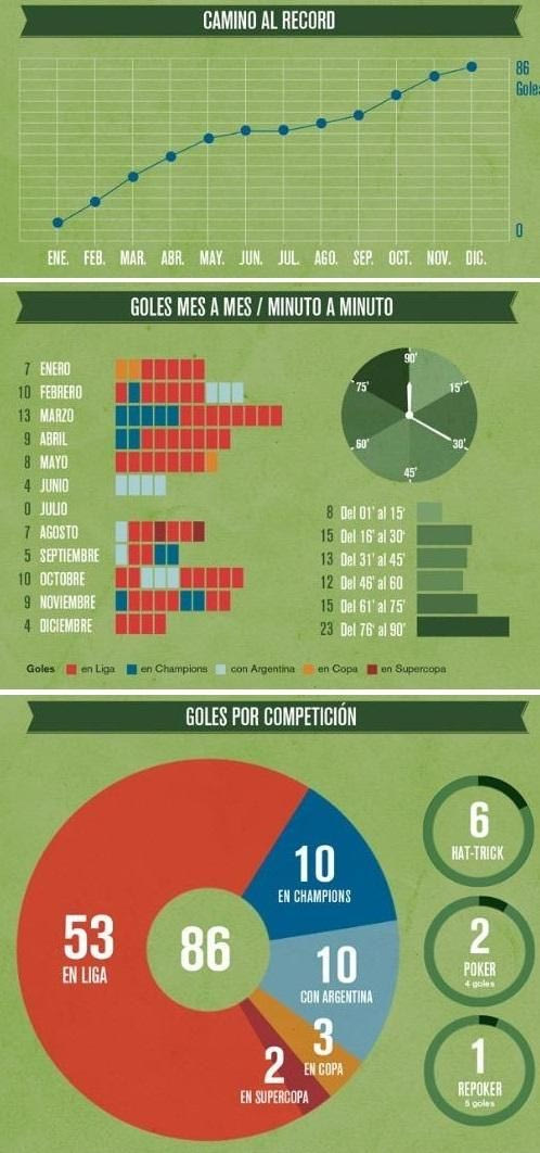 Η ανάπτυξη του ρεκόρ του Αργεντινού σε 5.405 λεπτά αγώνα έχει ως εξής: 56 γκολ στο πρωτάθλημα, 13 στο Champions League, 3 στο Copa del Rey και 2 στο Supercopa, όσον αφορά στην Μπαρτσελόνα (74, 86,1%) και 5 γκολ σε προκριματικά Μουντιάλ και 7 γκολ σε φιλικά, όσον αφορά στην Αργεντινή (12, 13,9%).