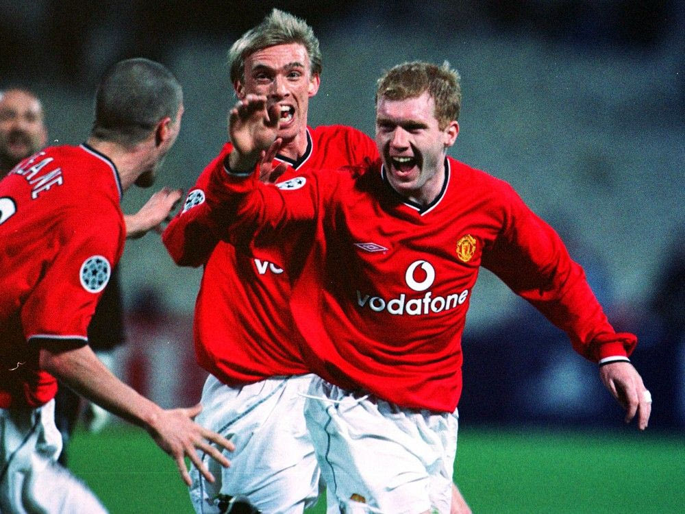 Ο Λουκ Τσάντγουικ πανηγυρίζει με Σκόουλς και Κιν την ισοφάρισε στο 93' του αγώνα με τον Παναθηναϊκό Eurokinissi