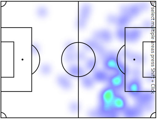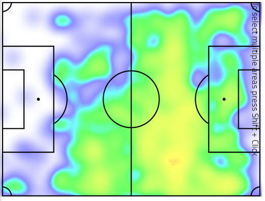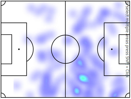 Ο θερμικός χάρτης του Φακούντο Περέιρα είναι αρκετά “προβλεπόμενος” για τον περιφερειακό επιθετικό, που ουσιαστικά παίρνει το ρόλο του επιτελικού μέσου, κινούμενος βέβαια αρκετά πιο κοντά στην αντίπαλη μεγάλη περιοχή. Η πιο “ζεστή” περιοχή στον θερμικό χάρτη του Αργεντινού είναι ο χώρο έξω από την μεγάλη περιοχή, και προς τα δεξιά, αν και υπάρχουν και “πατήματά” του και στις δυο γωνίες της μεγάλης περιοχής.