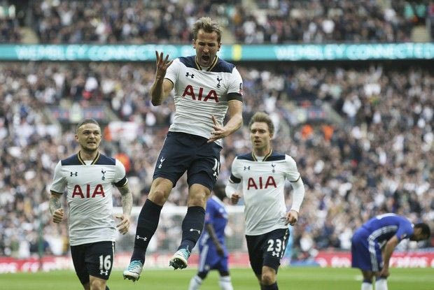 Tottenham's Harry Kane, center, celebrates after scoring his side's first goal during the English FA Cup semifinal soccer match between Chelsea and Tottenham Hotspur at Wembley stadium in London, Saturday, April 22, 2017. (AP Photo/Tim Ireland) AP