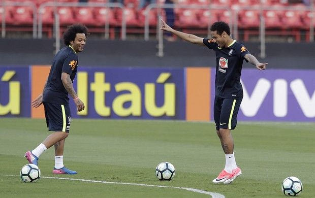 Brazil's Neymar, right, and Marcelo, attend a training session in Sao Paulo, Brazil, Saturday, March 25, 2017. Brazil will face Paraguay in a 2018 World Cup qualifying soccer match on March 28. (AP Photo/Andre Penner) AP Photo/Andre Penner